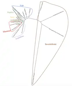 Over 100 orthologs exist for the human gene SCRN3.[23] The known orthologs were found to exist in vertebrates and invertebrates, but not in plants, bacteria, or fungi. The divergence date of 20 orthologs found were compared relative to Homo sapiens. Invertebrates are the most distantly related orthologs to human SCRN3, with the furthest median date of divergence from this set of orthologs being 694 million years ago.