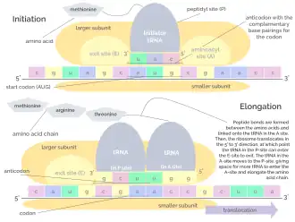 - Elongation: The last tRNA validated by the small ribosomal subunit (accommodation) transfers the amino acid. It carries to the large ribosomal subunit which binds it to one of the preceding admitted tRNA (transpeptidation). The ribosome then moves to the next mRNA codon to continue the process (translocation), creating an amino acid chain.