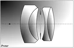 The first anastigmat was designed by Paul Rudolph for the German firm Carl Zeiss AG in 1890 and marketed as the Protar;[1]: 65–66(§103) it consisted of four elements in two groups, as an asymmetric arrangement of two cemented achromatic lens doublets and was improved to a five-element, two-group design in 1891, substituting a cemented triplet for the rear group.[2]: 82–83