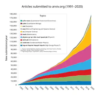arXiv (pronounced as "archive"—the X represents the Greek letter chi ⟨χ⟩)[1] is an open-access repository of electronic preprints and postprints (known as e-prints) approved for posting after moderation, but not peer reviewed. It consists of scientific papers in the fields of mathematics, physics, astronomy, electrical engineering, computer science, quantitative biology, statistics, mathematical finance, and economics, which can be accessed online. In many fields of mathematics and physics, almost all scientific papers are self-archived on the arXiv repository before publication in a peer-reviewed journal. Some publishers also grant permission for authors to archive the peer-reviewed postprint. Begun on August 14, 1991, arXiv.org passed the half-million-article milestone on October 3, 2008,[2][3] had hit a million by the end of 2014[4][5] and two million by the end of 2021.[6][7] As of November 2024, the submission rate is about 24,000 articles per month.[8]