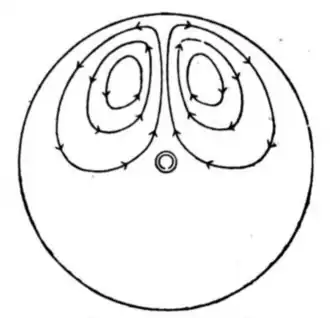 The direction of the circulation of eddy-currents is always such as to tend to oppose the relative motion. The eddy-current in the part receding from the poles tends to attract the poles forward or to drag this part of the disk backwards. The eddy-current in the part advancing toward the poles tends to repel those poles and to be repelled by them. It is obvious that any slits cut in the disk will tend to limit the flow of the eddy-currents, and by limiting them to increase the resistance of their possible paths in the metal, though it will not diminish the electromotive-force. In the researches of Sturgeon[9][10][11] a number of experiments are described to ascertain the directions in which the eddy-currents flow in disks. Similar, but more complete researches were made by Matteuci. The induction in rotating spheres was mathematically investigated by Jochmann, and later by Hertz.