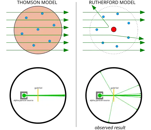 Between 1908 and 1913, Ernest Rutherford and his colleagues Hans Geiger and Ernest Marsden performed a series of experiments in which they bombarded thin foils of metal with a beam of alpha particles. They did this to measure the scattering patterns of the alpha particles. They spotted a small number of alpha particles being deflected by angles greater than 90°. This shouldn't have been possible according to the Thomson model of the atom, whose charges were too diffuse to produce a sufficiently strong electric field. The deflections should have all been negligible. Rutherford proposed that the positive charge of the atom is concentrated in a tiny volume at the center of the atom and that the electrons surround this nucleus in a diffuse cloud. This nucleus carried almost all of the atom's mass. Only such an intense concentration of charge, anchored by its high mass, could produce an electric field that could deflect the alpha particles so strongly.[19]