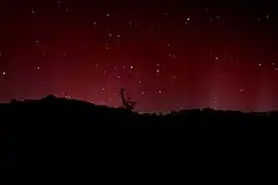 First reported in 2020,[45][46] and confirmed in 2021,[47][48] the dune aurora phenomenon was discovered[49] by Finnish citizen scientists. It consists of regularly spaced, parallel stripes of brighter emission in the green diffuse aurora which gives the impression of sand dunes.[50] The phenomenon is believed to be caused by the modulation of atomic oxygen density by a large-scale atmospheric wave travelling horizontally in a waveguide through an inversion layer in the mesosphere in presence of electron precipitation.[47]