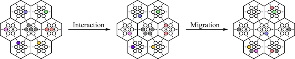 A new time step begins when both interaction and transport steps have occurred. Therefore, the dynamics of the BIO-LGCA can be summarized as the stochastic finite-difference microdynamical equation