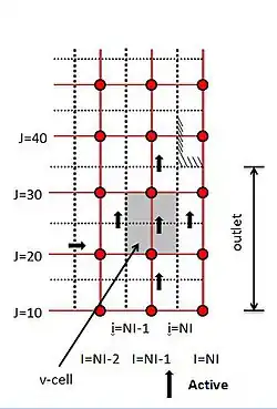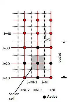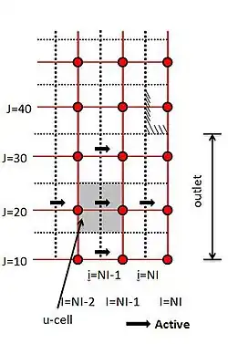 The equations are solved for cells up to NI-1, outside the domain values of flow variables are determined by extrapolation from the interior by assuming zero gradients at the outlet plane