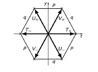 All the other states of the representation can be constructed by the successive application of the ladder operators and and by identifying the base states which are annihilated by the action of the lowering operators. These operators can be pictured as arrows whose endpoints form the vertices of a hexagon (picture for generators above).
