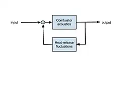 The simplest example of a thermoacoustic combustion instability is perhaps that happening in a horizontal Rijke tube (see also thermoacoustics): Consider the flow through a horizontal tube open at both ends, in which a flat flame sits at a distance of one-quarter the tube length from the leftmost end. In a similar way to an organ pipe, acoustic waves travel up and down the tube producing a particular pattern of standing waves. Such a pattern also forms in actual combustors, but takes a more complex form.[9] The acoustic waves perturb the flame. In turn, the flame affects the acoustics. This feedback between the acoustic waves in the combustor and the heat-release fluctuations from the flame is a hallmark of thermoacoustic combustion instabilities. It is typically represented with a block diagram (see figure). Under some conditions, the perturbations will grow and then saturate, producing a particular noise. In fact, it is said that the flame of a Rijke tube sings.