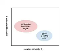 Because of these hazards, the engineering design process of engines involves the determination of a stability map (see figure). This process identifies a combustion-instability region and attempts to either eliminate this region or moved the operating region away from it. This is a very costly iterative process. For example, the numerous tests required to develop rocket engines [4] are largely in part due to the need to eliminate or reduce the impact of thermoacoustic combustion instabilities.