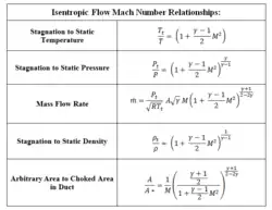 can be obtained, where M is the Mach number and γ is the ratio of specific heats (1.4 for air). See table of isentropic flow Mach number relationships.