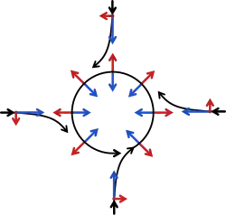 Air within high-pressure systems rotates in a direction such that the Coriolis force is directed radially inwards, and nearly balanced by the outwardly radial pressure gradient. As a result, air travels clockwise around high pressure in the Northern Hemisphere and anticlockwise in the Southern Hemisphere. Air around low-pressure rotates in the opposite direction, so that the Coriolis force is directed radially outward and nearly balances an inwardly radial pressure gradient.[38]