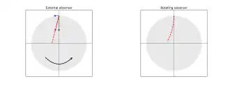 In the inertial frame of reference (upper part of the picture), the black ball moves in a straight line. However, the observer (red dot) who is standing in the rotating/non-inertial frame of reference (lower part of the picture) sees the object as following a curved path due to the Coriolis and centrifugal forces present in this frame.[1]