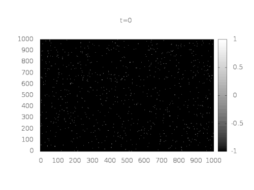 The external force K is multiplied by time (t), where K is a positive scalar constant, however this can be varying and or negative as well. S represents the state of a cell (+1 or −1), the second component takes the sum of the four neighbouring cell states (up, down, left & right) and multiplies it by another scalar quantity, this is analogous to a coupling constant (J). The random number generator (r) is a normally distributed range of values with a mean of zero and a fixed standard deviation (rσ), this is also multiplied by a scalar constant (X). Of the three components of the net force (F), the neighbour and random components can produce positive and negative values, while the external force is only positive meaning that there is a forward bias applied to the system which over time becomes the dominant force.