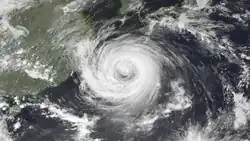 Eyewall mesovortices are small scale rotational features found in the eyewalls of intense tropical cyclones. They are similar, in principle, to small "suction vortices" often observed in multiple-vortex tornadoes.[17] In these vortices, wind speeds may be greater than anywhere else in the eyewall.[18] Eyewall mesovortices are most common during periods of intensification in tropical cyclones.[17]