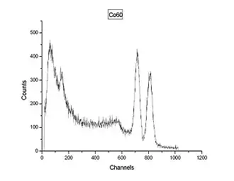 Co, with two gamma rays with 1.17 MeV and 1.33 MeV respectively. (See the decay scheme article for the decay scheme of cobalt-60.) The two gamma lines can be seen well-separated; the peak to the left of channel 200 most likely indicates a strong background radiation source that has not been subtracted. A backscatter peak can be seen near channel 150, similar to the second peak in Figure 1.
