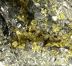 Gold often occurs in free elemental (native state), as nuggets or grains, in rocks, veins, and alluvial deposits. It occurs in a solid solution series with the native element silver (as in electrum), naturally alloyed with other metals like copper and palladium, and mineral inclusions such as within pyrite. Less commonly, it occurs in minerals as gold compounds, often with tellurium (gold tellurides).