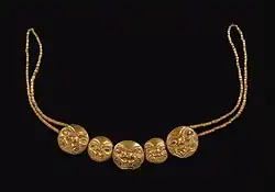 The symbol Au is from the Latin aurum 'gold'.[19] The Proto-Indo-European ancestor of aurum was *h₂é-h₂us-o-, meaning 'glow'. This word is derived from the same root (Proto-Indo-European *h₂u̯es- 'to dawn') as *h₂éu̯sōs, the ancestor of the Latin word aurora 'dawn'.[20] This etymological relationship is presumably behind the frequent claim in scientific publications that aurum meant 'shining dawn'.[21]