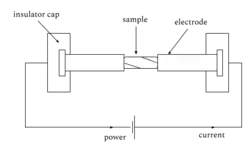 There are different configurations for continuous ohmic heating systems, but in the most basic process,[11] a power supply or generator is needed to produce electrical current.[10] Electrodes, in direct contact with food, pass electric current through the matrix.[10] The distance between the electrodes can be adjusted to achieve the optimum electrical field strength.[10]
