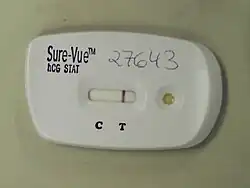A lateral flow test (LFT),[1] is an assay also known as a lateral flow immunochromatographic test (ICT), or rapid test. It is a simple device intended to detect the presence of a target substance in a liquid sample without the need for specialized and costly equipment. LFTs are widely used in medical diagnostics in the home, at the point of care, and in the laboratory. For instance, the home pregnancy test is an LFT that detects a specific hormone. These tests are simple and economical and generally show results in around five to thirty minutes.[2] Many lab-based applications increase the sensitivity of simple LFTs by employing additional dedicated equipment.[3] Because the target substance is often a biological antigen, many lateral flow tests are rapid antigen tests (RAT or ART).