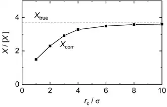 Different correction schemes have been developed to account for the influence of the long-range interactions in simulations and to sustain a sufficiently good approximation of the 'full' potential.[16][14] They are based on simplifying assumptions regarding the structure of the fluid. For simple cases, such as in studies of the equilibrium of homogeneous fluids, simple correction terms yield excellent results. In other cases, such as in studies of inhomogeneous systems with different phases, accounting for the long-range interactions is more tedious. These corrections are usually referred to as 'long-range corrections'. For most properties, simple analytical expressions are known and well established. For a given observable , the 'corrected' simulation result is then simply computed from the actually sampled value and the long-range correction value , e.g. for the internal energy .[14] The hypothetical true value of the observable of the Lennard-Jones potential at truly infinite cut-off distance (thermodynamic limit) can in general only be estimated.