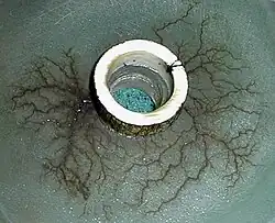 A Lichtenberg figure (German: Lichtenberg-Figur), or Lichtenberg dust figure, is a branching electric discharge that sometimes appears on the surface or in the interior of insulating materials. Lichtenberg figures are often associated with the progressive deterioration of high-voltage components and equipment. The study of planar Lichtenberg figures along insulating surfaces and 3D electrical trees within insulating materials often provides engineers with valuable insights for improving the long-term reliability of high-voltage equipment. Lichtenberg figures are now known to occur on or within solids, liquids, and gases during electrical breakdown.