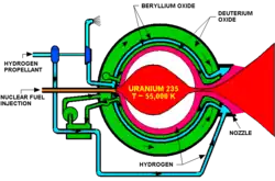 In June 2025, the European Space Agency proposed their own NTP engine called Alumni.[10] At the same time, another form of nuclear thermal propulsion, called centrifugal nuclear thermal rocket uses liquid uranium for fuel.[11]
