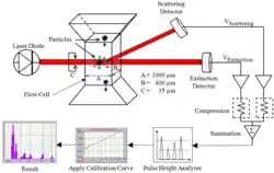 A focused laser beam rotates in a constant frequency and interacts with particles within the sample medium. Each randomly scanned particle obscures the laser beam to its dedicated photo diode, which measures the time of obscuration.
