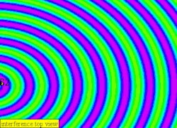 Interference can be produced by the use of two dippers that are attached to the main ripple bar.[1] In the diagrams below on the left the light areas represent crests of waves, the black areas represent troughs. Notice the grey areas: they are areas of destructive interference where the waves from the two sources cancel one another out. To the right is a photograph of two-point interference generated in a circular ripple tank.