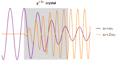 Second-harmonic generation (SHG), also known as frequency doubling, is the lowest-order wave-wave nonlinear interaction that occurs in various systems, including optical, radio, atmospheric, and magnetohydrodynamic systems.[1] As a prototype behavior of waves, SHG is widely used, for example, in doubling laser frequencies. SHG was initially discovered as a nonlinear optical process[2] in which two photons with the same frequency interact with a nonlinear material, are "combined", and generate a new photon with twice the energy of the initial photons (equivalently, twice the frequency and half the wavelength), that conserves the coherence of the excitation. It is a special case of sum-frequency generation (2 photons), and more generally of harmonic generation.
