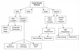 Basic crystal growth methods can be separated into four categories based on what they are artificially grown from: melt, solid, vapor, and solution.[2] Specific techniques to produce large single crystals (aka boules) include the Czochralski process (CZ), floating zone (or zone movement), and the Bridgman technique. Dr. Teal and Dr. Little of Bell Telephone Laboratories were the first to use the Czochralski method to create Ge and Si single crystals.[7] Other methods of crystallization may be used, depending on the physical properties of the substance, including hydrothermal synthesis, sublimation, or simply solvent-based crystallization.[8] For example, a modified Kyropoulos method can be used to grow high quality 300 kg sapphire single crystals.[9] The Verneuil method, also called the flame-fusion method, was used in the early 1900s to make rubies before CZ.[6] The diagram on the right illustrates most of the conventional methods. There have been new breakthroughs such as chemical vapor depositions (CVD) along with different variations and tweaks to the existing methods. These are not shown in the diagram.