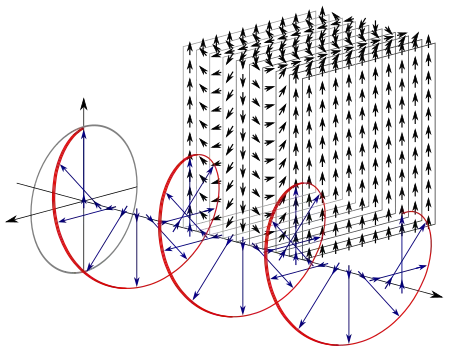 Represented in the second illustration is a circularly polarized, electromagnetic plane wave. Each blue vector indicating the perpendicular displacement from a point on the axis out to the helix, also represents the magnitude and direction of the electric field for an entire plane perpendicular to the axis.