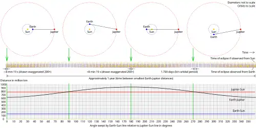 Ole Rømer used an astronomical measurement to make the first quantitative estimate of the speed of light in the year 1676.[100][101] When measured from Earth, the periods of moons orbiting a distant planet are shorter when the Earth is approaching the planet than when the Earth is receding from it. The difference is small, but the cumulative time becomes significant when measured over months. The distance travelled by light from the planet (or its moon) to Earth is shorter when the Earth is at the point in its orbit that is closest to its planet than when the Earth is at the farthest point in its orbit, the difference in distance being the diameter of the Earth's orbit around the Sun. The observed change in the moon's orbital period is caused by the difference in the time it takes light to traverse the shorter or longer distance. Rømer observed this effect for Jupiter's innermost major moon Io and deduced that light takes 22 minutes to cross the diameter of the Earth's orbit.[100]