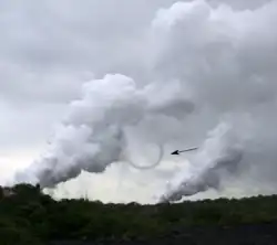 Steam devils are vortices typically about 50 to 200 metres in diameter, essentially vertical, and up to 500 metres high. The general shape is like a small waterspout but they should not be considered related. Steam devils rotate with a cyclonic direction of motion, but not very fast or powerfully, usually just a few rotations per minute, and sometimes apparently not at all. There is usually a well-defined inner part of the rotating column of steam and a more ragged outer part from which clumps of steam often detach. Rather smaller steam devils can form over small lakes, especially the warm water in the hot springs of geyser basins. In these cases typical dimensions are a metre or so diameter, but can vary from less than 0.1 to 2 metres, and a height of 2 to 30 metres with a somewhat faster rotation of 60 rpm or so. The central core of the steam devil can be clear, in the same sense that the centre of a dust devil is clear of dust. The core is around 10% of the width of the rotating column. The sky above the steam devils may be clear, or there may be cumulus clouds present. In some cases the steam devils may rise directly into the cumulus, in these cases the cumulus may actually be caused by the steam devils - see below. Steam devils are a rare and short-lived phenomenon, typically surviving no more than three or four minutes, and the smaller ones over hot springs dissipating in a matter of seconds.[5][note 1] Steam devils are sometimes confused with waterspouts as they can occur over the water.[6]
