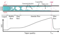 Flow boiling is boiling at a flowing fluid. Compared with pool boiling, flow boiling heat transfer depends on many factors including flow pressure, mass flow rate, fluid type, upstream condition, wall materials, system geometry, and applied heat flux. Characterization of flow boiling requires comprehensive consideration of operating condition.[5] In 2021 a prototype electric vehicle charging cable using flow boiling was able to remove 24.22 kW of heat, allowing the charging current to reach 2,400 amps, far higher than state of the art charging cables that top out at 520 amps.[6]