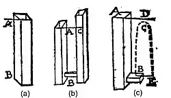 He starts a tube AB (Figure (a)) filled up with water to the level A. Then a narrow opening is drilled at the level of B and connected to a second vertical tube BC. Due to the hydrostatic principle of communicating vessels the water lifts up to the same filling level AC in both tubes (Figure (b)). When finally the tube BC is removed (Figure (c)) the water should again lift up to this height, which is named AD in Figure (c). The reason for that behavior is the fact that a droplet's falling velocity from a height A to B is equal to the initial velocity that is needed to lift up a droplet from B to A.