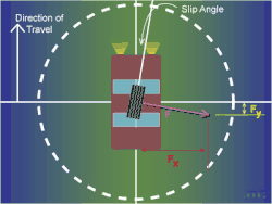 In this example, the vehicle would be cornering to the right (i.e. the positive x direction points to the center of the corner). Note that the plane of rotation of the tire is at an angle to the actual direction that the tire is moving (the positive y direction). Put differently, rather than being allowed to simply "roll" in the direction that it is "pointing" (in this case, rightwards from the positive y direction), the tire instead must "slip" in a different direction from that which it is pointing in order to maintain its "forward" motion in the positive y direction. This difference between the direction the tire "points" (its plane of rotation) and the tire's actual direction of travel is the slip angle.