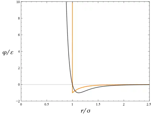 The force magnitude between two spherically symmetric molecules is written as , where is the pair potential function, and the force direction is along the line connecting the two mass centers. The specific functional relation is most simply characterized by a single length, , and a minimum energy, (with ). Two of the many such functions that have been suggested are shown in Fig. B.[11]
