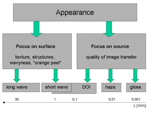 Figure 1:Manifestation of surface properties upon reflection of light. Structures with dimensions, λ, above 0,1 mm can be seen directly by the unaided eye (focus on surface), smaller structures become manifest by their effect on the directional distribution of the reflected light (focus on source). Structures at and below 0,1 mm reduce the distinctness of image (DOI), structures in the range of 0,01 mm induce haze and even smaller structures affect the gloss of the surface. |