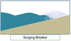 When wind waves approach to coast area from deep water, the waves change their heights and lengths. The wave height becomes higher and the wavelength becomes shorter as the wave velocity is slowed when ocean waves approach to the shore. If the water depth is sufficiently shallow, the wave crest become steeper and the trough gets broader and shallower; finally, the ocean waves break at the shore. The motions of wave breaking are different with along to the steepness of shores and waves, and can be categorized by below three types.[11][12]
