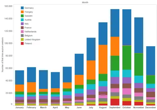 The 2015 European migrant crisis was a period of significantly increased movement of refugees and migrants into Europe, mostly from the Middle East. An estimated 1.3 million people came to the continent to request asylum,[2] the most in a single year since World War II.[3] They were mostly Syrians,[4] but also included a significant number of people from Afghanistan, Pakistan, Iraq, Nigeria, Eritrea,[5] and the Balkans.[6] The increase in asylum seekers has been attributed to factors such as the escalation of various wars in the Middle East and ISIL's territorial and military dominance in the region due to the Arab Winter, as well as Lebanon, Jordan, and Egypt ceasing to accept Syrian asylum seekers.[7]