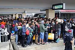 On 1 September, Hungarian government closed outbound rail traffic from Budapest's Keleti station, which many refugees were using to travel to Austria and Germany.[97] Within days, a massive buildup of people had formed at the station. On 4 September, several thousand set off to make the 150 km journey towards Austria on foot, at which point the Hungarian government relented and no longer tried to stop them. In an effort to force the Austrian and German governments' hands, Hungary chartered buses to the Austrian border for both those walking and those who had stayed behind at the station.[98] Unwilling to resort to violence to keep them out, and faced with a potential humanitarian crisis if the huge numbers languished in Hungary indefinitely,[95][99] Germany and Austria jointly announced on 4 September that they would allow the migrants to cross their borders and apply for asylum.[100][101] Across Germany, crowds formed at train stations to applaud and welcome the arrivals.[102]