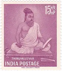Various claims have been made regarding Valluvar's family background and occupation in the colonial era literature, all inferred from selective sections of his text or hagiographies published since the colonial era started in Tamil Nadu.[55] One traditional version claims that he was a Paraiyar weaver.[56] Another theory is that he must have been from the agricultural caste of Vellalars because he extols agriculture in his work.[10] Another states he was an outcaste, born to a Pariah woman and a Brahmin father.[10][55][57] Mu Raghava Iyengar speculated that "valluva" in his name is a variation of "vallabha", the designation of a royal officer.[10] S. Vaiyapuri Pillai derived his name from "valluvan" (a Paraiyar caste of royal drummers) and theorized that he was "the chief of the proclaiming boys analogous to a trumpet-major of an army".[10][58] The traditional biographies not only are inconsistent, but also contain incredulous claims about the author of the Kural text. Along with various versions of his birth circumstances, many state he went to a mountain and met the legendary Agastya and other sages.[59] There are also accounts claiming that, during his return journey, Valluvar sat under a tree whose shadow sat still over him and did not move the entire day, he killed a demon, and many more.[59] Scholars consider these and all associated aspects of these hagiographic stories to be fiction and ahistorical, a feature common to "international and Indian folklore". The alleged low birth, high birth and being a pariah in the traditional accounts are also doubtful.[60] Traditionally, Valluvar is believed to have married to Vasuki[61] and had a friend and a disciple named Elelasingan.[62][63]