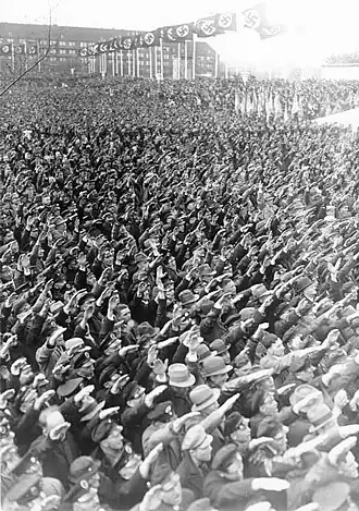 Some party members questioned the legitimacy of the so-called Roman salute, employed by Fascist Italy, as un-Germanic.[36] In response, efforts were made to establish its pedigree by inventing a tradition after the fact.[36] In June 1928, Rudolf Hess published an article titled "The Fascist Greeting", which claimed that the gesture was used in Germany as early as 1921, before the Nazis had heard about the Italian Fascists.[38] He admits in the article: "The NSDAP's introduction of the raised-arm greeting approximately two years ago still gets some people's blood boiling. Its opponents suspect the greeting of being un-Germanic. They accuse it of merely aping the [Italian] Fascists",[39] but goes on to ask, "even if the decree from two years ago [Hess' order that all party members use it] is seen as an adaption of the Fascist gesture, is that really so terrible?".[39] Ian Kershaw points out that Hess did not deny the likely influence from Fascist Italy, even if indeed the salute had been used sporadically in 1921 as Hess claimed.[40]
