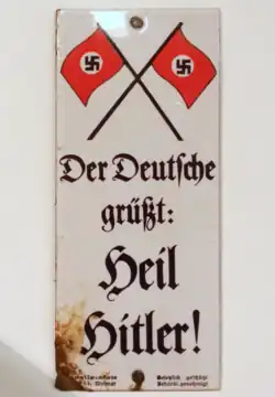 The salute soon became part of everyday life, a historically unique phenomenon that politicised all communication in Germany for twelve years, superseding all prior forms of greeting, such as "Grüß Gott" ("Hello"), "Guten Tag" ("Good day"), and "Auf Wiederseh(e)n" ("Goodbye").[56] Postmen used the greeting when they knocked on people's doors to deliver packages or letters.[56] Small metal signs that reminded people to use the Hitler salute were displayed in public squares and on telephone poles and street lights throughout Germany.[57] Department store clerks greeted customers with "Heil Hitler, how may I help you?"[56] Dinner guests brought glasses etched with the words "Heil Hitler" as house gifts.[56] The salute was required of all persons passing the Feldherrnhalle in Munich, site of the climax of the 1923 Beer Hall Putsch, which the government had made into a shrine to the Nazi dead; so many pedestrians avoided this mandate by detouring through the small Viscardigasse behind that the passage acquired the nickname "Dodgers' Alley" (Drückebergergasse).[58] The daughter of the American Ambassador to Germany, Martha Dodd, describes the first time she saw the salute: