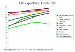 Rather than income, poverty is also measured through individual basic needs at a time. Life expectancy has greatly increased in the developing world since World War II and is starting to close the gap to the developed world.[47] Child mortality has decreased in every developing region of the world.[48] The proportion of the world's population living in countries where the daily per-capita supply of food energy is less than 9,200 kilojoules (2,200 kilocalories) decreased from 56% in the mid-1960s to below 10% by the 1990s. Similar trends can be observed for literacy, access to clean water and electricity and basic consumer items.[49]