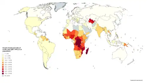 Statistically, as of 2019, most of the world's population live in poverty: in PPP dollars, 85% of people live on less than $30 per day, two-thirds live on less than $10 per day, and 10% live on less than $1.90 per day.[3] According to the World Bank Group in 2020, more than 40% of the poor live in conflict-affected countries.[4] Even when countries experience economic development, the poorest citizens of middle-income countries frequently do not gain an adequate share of their countries' increased wealth to leave poverty.[5] Governments and non-governmental organizations have experimented with a number of different policies and programs for poverty alleviation, such as electrification in rural areas or housing first policies in urban areas. The international policy frameworks for poverty alleviation, established by the United Nations in 2015, are summarized in Sustainable Development Goal 1: "No Poverty".