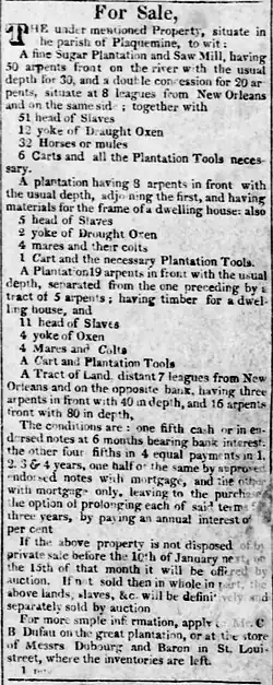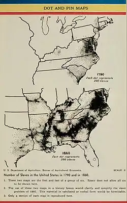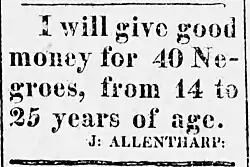 Slavery in the United States was a variable thing, in "constant flux, driven by the violent pursuit of ever-larger profits."[65] The enslaved labor force of the United States, while stereotypically drawn as field labor for the production of cash crops like sugar and cotton, performed nearly every type of skilled labor sought by the economy. An examination of 1200 runaway slave ads published in Tennessee found 25 blacksmiths, 18 carpenters, and 13 shoemakers, as well as barbers, boat builders, bricklayers, a "conjurer or fortune teller," cooks, coopers, cotton mill engineers, dressmakers (often called mantuamakers), hack drivers, iron furnace engineers, milliners, millwrights, ministers, musicians (most commonly of the fiddle/violin), a racehorse trainer, ostlers, plasterers, painters, seamstresses, stonemasons, tanners, a "turner and tin-plate workman," wagoners, waiters, and weavers.[66] Complex as it was, historians do know, however, that slavery in the United States was not a "deferred-compensation trade school opportunity."[67] Harriet Beecher Stowe summarized slavery in the United States in 1853:[68]